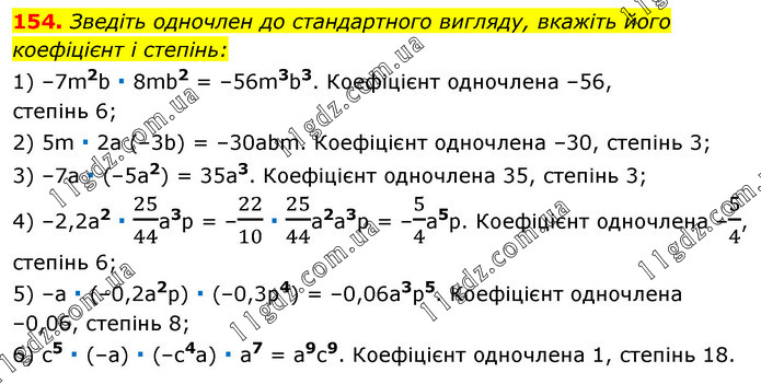 Зведіть одночлен до стандартного вигляду, вкажіть його коефіцієнт і степінь: 1) –7m2b ∙ 8mb2 = –56m3b3. Коефіцієнт одночлена –56, степінь 6; 2) 5m ∙ 2а (–3b) = –30abm. Коефіцієнт одночлена –30, степінь 3; 3) –7a ∙ (–5а2) = 35а3. Коефіцієнт одночлена 35, степінь 3; 4) –2,2a2 ∙ 25/44a3p = –22/10 ∙ 25/44a2a3p = –5/4a5p. Коефіцієнт одночлена –5/4, степінь 6; 5) –а ∙ (–0,2a2р) ∙ (–0,3p4) = –0,06а3р5. Коефіцієнт одночлена –0,06, степінь 8; 6) с5 ∙ (–а) ∙ (–с4а) ∙ а7 = а9с9. Коефіцієнт одночлена 1, степінь 18.