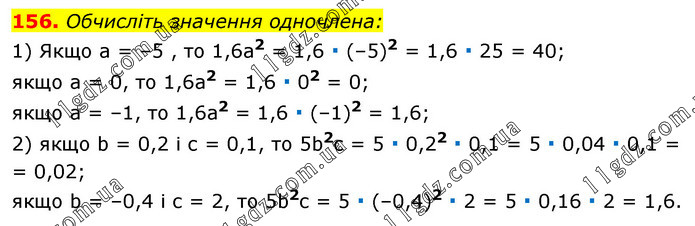 Обчисліть значення одночлена: 1) Якщо а = –5 , то 1,6а2 = 1,6 ∙ (–5)2 = 1,6 ∙ 25 = 40; якщо а = 0, то 1,6а2 = 1,6 ∙ 02 = 0; якщо а = –1, то 1,6а2 = 1,6 ∙ (–1)2 = 1,6; 2) якщо b = 0,2 і с = 0,1, то 5b2c = 5 ∙ 0,22 ∙ 0,1 = 5 ∙ 0,04 ∙ 0,1 = = 0,02; якщо b = –0,4 і с = 2, то 5b2c = 5 ∙ (–0,4)2 ∙ 2 = 5 ∙ 0,16 ∙ 2 = 1,6.