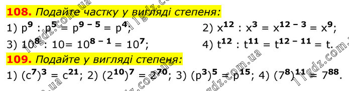 108. Подайте частку у вигляді степеня: 1) p9 : p5 = p9 – 5 = р4; 3) 108 : 10= 108 – 1 = 107; 2) x12 : x3 = х12 – 3 = х9; 4) t12 : t11 = t12 – 11 = t. 109. Подайте у вигляді степеня: 1) (с7)3 = с21; 2) (210)7 = 270; 3) (р3)5 = р15; 4) (78)11 = 788.