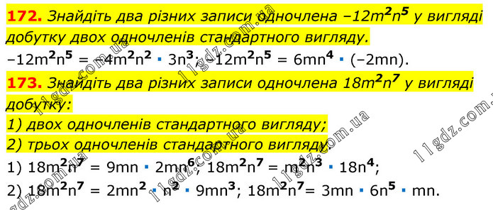 172. Знайдіть два різних записи одночлена –12m2n5 у вигляді добутку двох одночленів стандартного вигляду. –12m2n5 = –4m2n2 ∙ 3n3; –12m2n5 = 6mn4 ∙ (–2mn). 173. Знайдіть два різних записи одночлена 18m2n7 у вигляді добутку: 1) двох одночленів стандартного вигляду; 2) трьох одночленів стандартного вигляду. 1) 18m2n7 = 9mn ∙ 2mn6; 18m2n7 = m2n3 ∙ 18n4; 2) 18m2n7 = 2mn2 ∙ n2 ∙ 9mn3; 18m2n7= 3mn ∙ 6n5 ∙ mn.