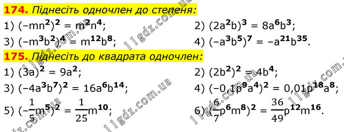 174. Піднесіть одночлен до степеня: 1) (–mn2)2 = m2n4; 3) (–m3b2)4 = m12b8; 2) (2a2b)3 = 8a6b3; 4) (–a3b5)7 = –a21b35. 175. Піднесіть до квадрата одночлен: 1) (3а)2 = 9а2; 3) (–4a3b7)2 = 16a6b14; 5) (–1/5m5)2 = 1/25m10; 2) (2b2)2 = 4b4; 4) (–0,1p9a4)2 = 0,01p18a8; 6) (6/7p6m8)2 = 36/49p12m16.