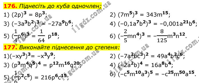 176. Піднесіть до куба одночлен: 1) (2р)3 = 8p3; 3) (–3a3b2)3 = –27а9b6; 5) (1/4p6)3 = 1/64 p18; 2) (7m5)3 = 343m15; 4) (–0,1а7b2)3 = –0,001а21b6; 6) (–2/5mn4)3 = –8/125m3n12. 177. Виконайте піднесення до степеня: 1)(–хy3)3= –х3y9; 3) (p3m4q5)4 = p12m16q20; 5) (1/6p2c5) = 216р6c15; 2) (–7a2bc3)2 = 49а4b2c6; 4) (–2a2b)4 = 16a8b4; 6) (–c5m10a3)5 = –c25m50a15.