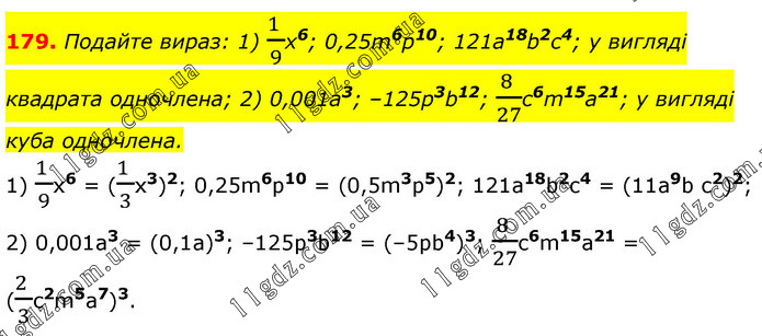 Подайте вираз: 1) (1 )/9x6; 0,25m6p10; 121а18b2c4; у вигляді квадрата одночлена; 2) 0,001а3; –125р3b12; (8 )/27c6m15a21; у вигляді куба одночлена. 1) (1 )/9x6 = ((1 )/3x3)2; 0,25m6p10 = (0,5m3p5)2; 121а18b2c4 = (11а9b с2)2; 2) 0,001а3 = (0,1а)3; –125р3b12 = (–5pb4)3; (8 )/27c6m15a21 = ((2 )/3c2m5a7)3.