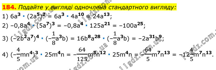 Подайте у вигляді одночлена стандартного вигляду: 1) 6а3 ∙ (2а5)2 = 6а3 ∙ 4а10 = 24а13; 2) –0,8а4 ∙ (5а7)3 = –0,8а4 ∙ 125а21 = –100а25; 3) (–2b2а7)4 ∙ (–1/8a3b) = 16b8a28 ∙ (–1/8a3b) = –2а31b9; 4) (–4/5mn4)3 ∙ 25m4n = –64/125m3n12 ∙ 25m4n = –64/5m7n13 = –124/5m7n13.