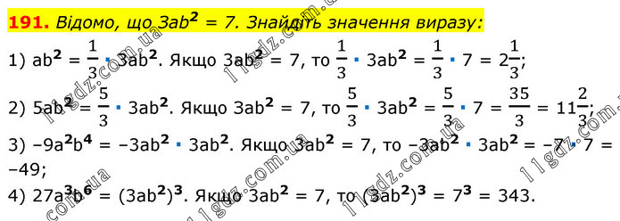 Відомо, що Заb2 = 7. Знайдіть значення виразу: 1) ab2 = 1/3 ∙ 3ab2. Якщо 3аb2 = 7, то 1/3 ∙ 3аb2 = 1/3 ∙ 7 = 21/3; 2) 5ab2 = 5/3 ∙ 3аb2. Якщо Заb2 = 7, то 5/3 ∙ 3ab2 = 5/3 ∙ 7 = 35/3 = 112/3; 3) –9а2b4 = –3аb2 ∙ 3аb2. Якщо 3аb2 = 7, то –3ab2 ∙ 3аb2 = –7 ∙ 7 = –49; 4) 27a3b6 = (3ab2)3. Якщо 3аb2 = 7, то (3аb2)3 = 73 = 343.