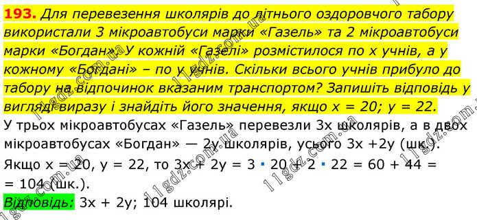 Для перевезення школярів до літнього оздоровчого табору використали 3 мікроавтобуси марки «Газель» та 2 мікроавтобуси марки «Богдан». У кожній «Газелі» розмістилося по х учнів, а у кожному «Богдані» – по у учнів. Скільки всього учнів прибуло до табору на відпочинок вказаним транспортом? Запишіть відповідь у вигляді виразу і знайдіть його значення, якщо х = 20; у = 22. У трьох мікроавтобусах «Газель» перевезли 3x школярів, а в двох мікроавтобусах «Богдан» — 2у школярів, усього 3x +2у (шк.). Якщо х = 20, у = 22, то 3х + 2y = 3 ∙ 20 + 2 ∙ 22 = 60 + 44 = = 104 (шк.). Відповідь: 3х + 2у; 104 школярі.