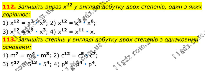 112. Запишіть вираз х12 у вигляді добутку двох степенів, один з яких дорівнює: 1) x12 = x3 ∙ х9; 2) x12 = x6 ∙ х6; 3) x12 = x9 ∙ x3; 4) x12 = x11 ∙ x. 113. Запишіть степінь у вигляді добутку двох степенів з однаковими основами: 1) m7 = m4 ∙ m3; 2) c12 = c5 ∙ c7; 3) 517 = 513 ∙ 54; 4) p8 = p4 ∙ p4.