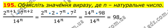 195. Обчисліть значення виразу, де n – натуральне число. (2^(n+1) • 7^(n+2))/14^n = (2^n • 2 • 7^n • 7^2)/14^n = (14^n • 98)/14^n = 98.