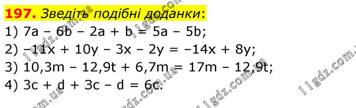 Зведіть подібні доданки: 1) 7а – 6b – 2а + b = 5a – 5b; 2) –11х + 10у – 3x – 2у = –14x + 8y; 3) 10,3m – 12,9t + 6,7m = 17m – 12,9t; 4) 3c + d + Зс – d = 6c.