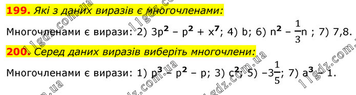 199. Які з даних виразів є многочленами: Многочленами є вирази: 2) 3р2 – р2 + х7; 4) b; 6) n2 – 1/3n ; 7) 7,8. 200. Серед даних виразів виберіть многочлени: Многочленами є вирази: 1) р3 – р2 – р; 3) с2; 5) –31/5; 7) а3 – 1.