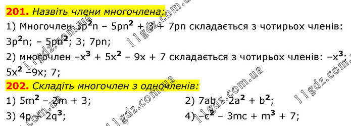 201. Назвіть члени многочлена: 1) Многочлен 3р2n – 5pn2 + 3 + 7pn складається з чотирьох членів: 3р2n; – 5рn2; 3; 7рn; 2) многочлен –x3 + 5x2 – 9х + 7 складається з чотирьох членів: –x3; 5х2 –9х; 7; 202. Складіть многочлен з одночленів: 1) 5m2 – 2m + 3; 3) 4р + 2q3; 2) 7ab – 2a2 + b2; 4) –с2 – 3mс + m3 + 7;