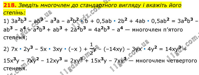 Зведіть многочлен до стандартного вигляду і вкажіть його степінь: 1) 3a2b3 – аb3 – а3а – а2b2 ∙ b + 0,5ab ∙ 2b2 + 4ab ∙ 0,5аb2 = 3a2b3 – ab3 – а4 – a2b3 + ab3 + 2а2b3 = 4a2b3 – а4 — многочлен п’ятого степеня; 2) 7х ∙ 2y3 – 5х ∙ 3ху ∙ (–x ) + 1/2y – (–14хy) – 3ух ∙ 4y2 = 14xy3 + 15х3у – 7xy2 – 12ху3 = 2хy3 + 15х3y – 7хy2 — многочлен четвертого стененя.