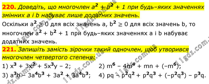 220. Доведіть, що многочлен а2 + b2 + 1 при будь–яких значеннях змінних а і b набуває лише додатних значень. Оскільки а2 ≥ 0 для всіх значень а, b2 ≥ 0 для всіх значень b, то многочлен а2 + b2 + 1 при будь–яких значеннях а і b набуває додатних значень. 221. Запишіть замість зірочки такий одночлен, щоб утворився многочлен четвертого степеня: 1) x3 + 3х2 + 5х3у – 2; 3) а3b – 3а4b3 + 3a2 + 3a4b3; 2) m6 – 4m4 + mn + (–m6); 4) pq – p2q2 + p2q3 + (–p2q3) – p3q.