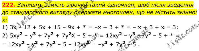 Запишіть замість зірочки такий одночлен, щоб після зведення до стандартного вигляду одержати многочлен, що не містить змінної x: 1) 3х – 12 + 5х + 15 – 9x + * = –x + 3 + * = – x + 3 + x = 3; 2) 5хy2 – y3 + 7y2 + 7y2X – 5 + * = 12ху2 – y3 +7y2 – 5 + * = = 12xy2 – y3 + 7y2 – 5 – 12хy2 = –y3 + 7y2 – 5 .