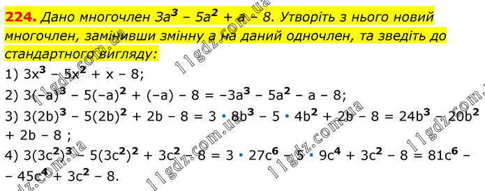 Дано многочлен За3 – 5а2 + а – 8. Утворіть з нього новий многочлен, замінивши змінну а на даний одночлен, та зведіть до стандартного вигляду: 1) 3х3 – 5х2 + х – 8; 2) 3(–а)3 – 5(–а)2 + (–а) – 8 = –3a3 – 5а2 – а – 8; 3) 3(2b)3 – 5(2b)2 + 2b – 8 = 3 ∙ 8b3 – 5 ∙ 4b2 + 2b – 8 = 24b3 – 20b2 + 2b – 8 ; 4) 3(3с2)3 – 5(3с2)2 + 3с2 – 8 = 3 ∙ 27с6 – 5 ∙ 9с4 + 3с2 – 8 = 81c6 – – 45с4 + 3с2 – 8.