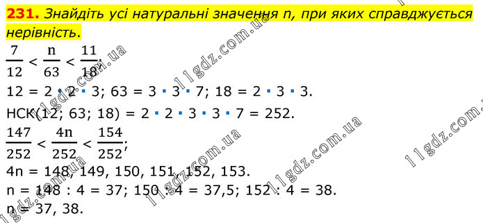 Знайдіть усі натуральні значення n, при яких справджується нерівність. 7/12 < n/63 < 11/18; 12 = 2 ∙ 2 ∙ 3; 63 = 3 ∙ 3 ∙ 7; 18 = 2 ∙ 3 ∙ 3. НСК(12; 63; 18) = 2 ∙ 2 ∙ 3 ∙ 3 ∙ 7 = 252. 147/252 < 4n/252 < 154/252; 4n = 148, 149, 150, 151, 152, 153. n = 148 : 4 = 37; 150 : 4 = 37,5; 152 : 4 = 38. n = 37, 38.