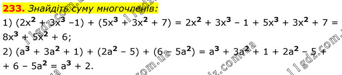 Знайдіть суму многочленів: 1) (2x2 + 3x3 –1) + (5x3 + 3x2 + 7) = 2x2 + 3x3 – 1 + 5x3 + 3х2 + 7 = 8х3 + 5x2 + 6; 2) (а3 + 3a2 + 1) + (2a2 – 5) + (6 – 5a2) = а3 + 3a2 + 1 + 2a2 – 5 + + 6 – 5a2 = a3 + 2.
