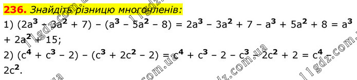 Знайдіть різницю многочленів: 1) (2a3 – 3a2 + 7) – (а3 – 5a2 – 8) = 2a3 – 3a2 + 7 – а3 + 5a2 + 8 = а3 + 2а2 + 15; 2) (с4 + с3 – 2) – (с3 + 2с2 – 2) = с4 + c3 – 2 – с3 – 2c2 + 2 = с4 – 2с2.