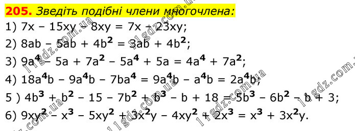 Зведіть подібні члени многочлена: 1) 7х – 15хy – 8хy = 7х – 23ху; 2) 8ab – 5ab + 4b2 = Зab + 4b2; 3) 9a4 – 5a + 7a2 – 5a4 + 5a = 4a4 + 7a2; 4) 18а4b – 9а4b – 7ba4 = 9a4b – a4b = 2a4b; 5 ) 4b3 + b2 – 15 – 7b2 + b3 – b + 18 = 5b3 – 6b2 – b + 3; 6) 9xy2 – x3 – 5xy2 + 3x2y – 4xy2 + 2x3 = x3 + 3x2y.