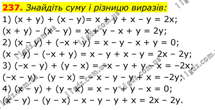 Знайдіть суму і різницю виразів: 1) (х + y) + (х – y)= х + y + х – y = 2х; (х + у) – (х – у) = х + у – х + у = 2у; 2) (х – у) + (–x + у) = х – у – х + у = 0; (х – у) – (–x + у) = х – у + х – у = 2х – 2у; 3) (–х – у) + (у – х) = –х – у + у – х = –2х; (–x – у) – (у – х) = – х – у – у + х = –2у; 4) (х – у) + (у – х) = х – у + у – х = 0; (х – у) – (у – х) – х – у – у + х = 2х – 2у.