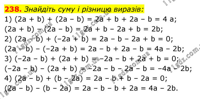 Знайдіть суму і різницю виразів: 1) (2а + b) + (2а – b) = 2а + b + 2а – b = 4 а; (2а + b) – (2a – b) = 2a + b – 2a + b = 2b; 2) (2а – b) + (–2а + b) = 2а – b – 2а + b = 0; (2а – b) – (–2а + b) = 2а – b + 2а – b = 4а – 2b; 3) (–2а – b) + (2а + b) = –2а – b + 2а + b = 0; (–2а – b) – (2а + b) = –2а – b – 2а – b = –4а – 2b; 4) (2а – b) + (b – 2а) = 2a – b + b – 2a = 0; (2а – b) – (b – 2а) = 2а – b – b + 2а = 4а – 2b.