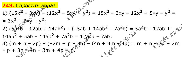 Спростіть вираз: 1) (15x2 – 3xу) – (12х2 – 5ху + у2) = 15х2 – 3xy – 12x2 + 5xy – y2 = = 3х2 + 2ху – y2; 2) (5а2b – 12аb + 14аb2) – (–5ab + 14аb2 – 7a2b) = 5a2b – 12ab + 14ab2 + 5ab – 14аb2 + 7a2b = 12а2b – 7аb; 3) (m + n – 2р) – (–2m + р – 3n) – (4n + 3m – 4р) = m + n – 2р + 2m – р + 3n – 4n – 3m + 4р = р.