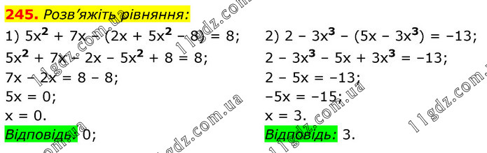 Розв’яжіть рівняння: 1) 5х2 + 7х – (2х + 5х2 – 8) = 8; 5х2 + 7х – 2х – 5х2 + 8 = 8; 7х – 2х = 8 – 8; 5х = 0; х = 0. Відповідь: 0; 2) 2 – 3х3 – (5х – 3х3) = –13; 2 – 3х3 – 5x + 3х3 = –13; 2 – 5х = –13; –5х = –15; х = 3. Відповідь: 3.
