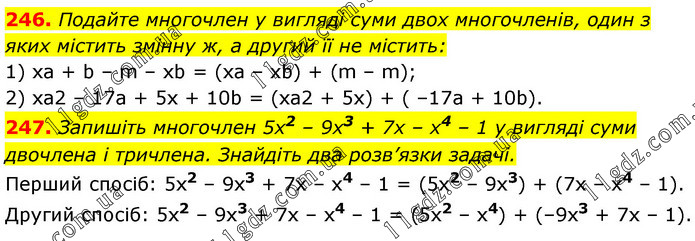 246. Подайте многочлен у вигляді суми двох многочленів, один з яких містить змінну ж, а другий її не містить: 1) ха + b – m – xb = (ха – xb) + (m – m); 2) ха2 – 17а + 5х + 10b = (ха2 + 5х) + ( –17а + 10b). 247. Запишіть многочлен 5х2 – 9х3 + 7x – х4 – 1 у вигляді суми двочлена і тричлена. Знайдіть два розв’язки задачі. Перший спосіб: 5х2 – 9х3 + 7x – х4 – 1 = (5х2 – 9х3) + (7х – х4 – 1). Другий спосіб: 5х2 – 9х3 + 7х – х4 – 1 = (5х2 – х4) + (–9х3 + 7x – 1).
