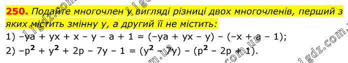 Подайте многочлен у вигляді різниці двох многочленів, перший з яких містить змінну у, а другий її не містить: 1) –уа + ух + х – у – а + 1 = (–уа + ух – у) – (–х + а – 1); 2) –р2 + у2 + 2р – 7y – 1 = (у2 – 7у) – (р2 – 2р + 1).