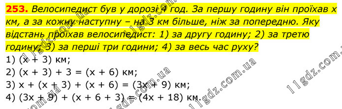 Велосипедист був у дорозі 4 год. За першу годину він проїхав х км, а за кожну наступну – на 3 км більше, ніж за попередню. Яку відстань проїхав велосипедист: 1) за другу годину; 2) за третю годину; 3) за перші три години; 4) за весь час руху? 1) (x + 3) км; 2) (x + 3) + 3 = (x + 6) км; 3) x + (x + 3) + (x + 6) = (3x + 9) км; 4) (3x + 9) + (x + 6 + 3) = (4x + 18) км.