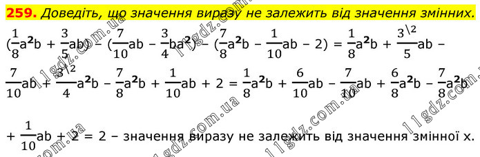 Доведіть, що значення виразу не залежить від значення змінних. (1/8a2b + 3/5ab) – (7/10ab – 3/4ba2) – (7/8a2b – 1/10ab – 2) = 1/8a2b + 3^(\2)/5ab – 7/10ab + 3^(\2)/4a2b – 7/8a2b + 1/10ab + 2 = 1/8a2b + 6/10ab – 7/10ab + 6/8a2b – 7/8a2b + 1/10ab + 2 = 2 – значення виразу не залежить від значення змінної х.
