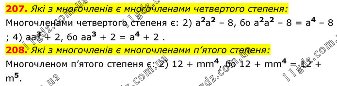 207. Які з многочленів є многочленами четвертого степеня: Многочленами четвертого степеня є: 2) a2a2 – 8, бо а2а2 – 8 = а4 – 8 ; 4) аа3 + 2, бо аа3 + 2 = а4 + 2 . 208. Які з многочленів є многочленами п’ятого степеня: Многочленом п’ятого степеня є: 2) 12 + mm4, бо 12 + mm4 = 12 + m5.