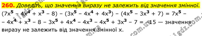 Доведіть, що значення виразу не залежить від значення змінної. (7х5 – 4х4 + x3 – 8) – (3х5 – 4х4 + 4х3) – (4х5 – 3х3 + 7) = 7х5 – – 4x4 + х3 – 8 – 3х5 + 4х4 – 4х3 – 4х5 + 3х3 – 7 = –15 — значення виразу не залежить від значення змінної х.