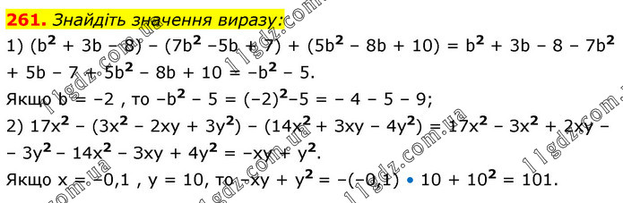 Знайдіть значення виразу: 1) (b2 + 3b – 8) – (7b2 –5b + 7) + (5b2 – 8b + 10) = b2 + 3b – 8 – 7b2 + 5b – 7 + 5b2 – 8b + 10 = –b2 – 5. Якщо b = –2 , то –b2 – 5 = (–2)2–5 = – 4 – 5 – 9; 2) 17x2 – (3х2 – 2ху + 3у2) – (14х2 + Зху – 4у2) = 17x2 – Зх2 + 2ху – – 3у2 – 14х2 – Зху + 4у2 = –ху + у2. Якщо х = –0,1 , у = 10, то –ху + у2 = –(–0,1) • 10 + 102 = 101.