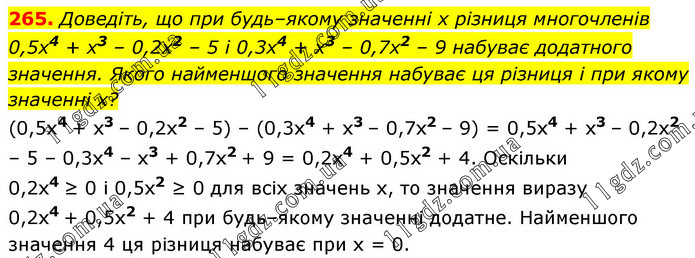Доведіть, що при будь–якому значенні х різниця многочленів 0,5x4 + x3 – 0,2x2 – 5 і 0,3x4 + x3 – 0,7x2 – 9 набуває додатного значення. Якого найменшого значення набуває ця різниця і при якому значенні х? (0,5x4 + x3 – 0,2x2 – 5) – (0,3х4 + х3 – 0,7х2 – 9) = 0,5х4 + x3 – 0,2х2 – 5 – 0,3х4 – x3 + 0,7x2 + 9 = 0,2х4 + 0,5х2 + 4. Оскільки 0,2х4 ≥ 0 і 0,5х2 ≥ 0 для всіх значень х, то значення виразу 0,2х4 + 0,5х2 + 4 при будь–якому значенні додатне. Найменшого значення 4 ця різниця набуває при х = 0.