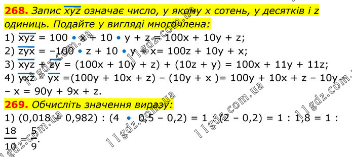 268. Запис хуz означає число, у якому x сотень, у десятків і z одиниць. Подайте у вигляді многочлена: 1) xyz = 100 • x + 10 • y + z = 100x + 10y + z; 2) zyx = –100 • z + 10 • у + х= 100z + 10у + х; 3) xyz + zy = (100x + 10y + z) + (10z + у) = 100x + 11y + 11z; 4) yxz – yx =(100у + 10x + z) – (10y + x )= 100y + 10x + z – 10y – – х = 90у + 9х + z. 269. Обчисліть значення виразу: 1) (0,018 + 0,982) : (4 • 0,5 – 0,2) = 1 : (2 – 0,2) = 1 : 1,8 = 1 : 18/10 = 5/9.