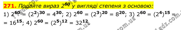 Подайте вираз 260 у вигляді степеня з основою: 1) 260 = (22)30 = 430; 2) 260 = (23)20 = 820; 3) 260 = (24)15 = = 1615; 4) 260 = (25)12 = 3212.