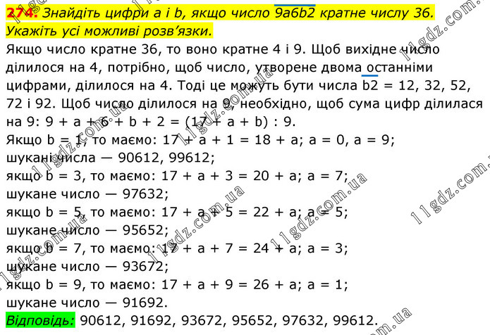 Знайдіть цифри а і b, якщо число 9а6b2 кратне числу 36. Укажіть усі можливі розв’язки. Якщо число кратне 36, то воно кратне 4 і 9. Щоб вихідне число ділилося на 4, потрібно, щоб число, утворене двома останніми цифрами, ділилося на 4. Тоді це можуть бути числа b2 = 12, 32, 52, 72 і 92. Щоб число ділилося на 9, необхідно, щоб сума цифр ділилася на 9: 9 + а + 6 + b + 2 = (17 + а + b) : 9. Якщо b = 1, то маємо: 17 + а + 1 = 18 + а; а = 0, а = 9; шукані числа — 90612, 99612; якщо b = 3, то маємо: 17 + а + 3 = 20 + а; а = 7; шукане число — 97632; якщо b = 5, то маємо: 17 + а + 5 = 22 + а; а = 5; шукане число — 95652; якщо b = 7, то маємо: 17 + а + 7 = 24 + а; а = 3; шукане число — 93672; якщо b = 9, то маємо: 17 + а + 9 = 26 + а; а = 1; шукане число — 91692. Відповідь: 90612, 91692, 93672, 95652, 97632, 99612