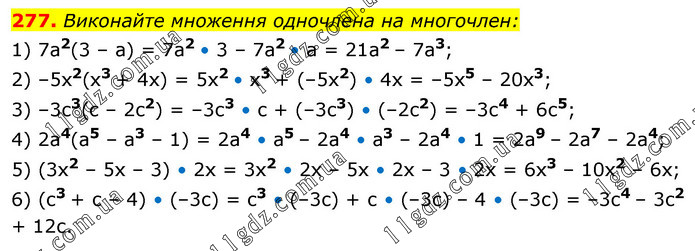 Виконайте множення одночлена на многочлен: 1) 7a2(3 – а) = 7a2 • 3 – 7а2 • а = 21а2 – 7а3; 2) –5x2(x3 + 4х) = 5х2 • x3 + (–5х2) • 4х = –5х5 – 20х3; 3) –3с3(с – 2с2) = –3с3 • с + (–3с3) • (–2с2) = –3с4 + 6с5; 4) 2а4(а5 – а3 – 1) = 2а4 • а5 – 2а4 • а3 – 2а4 • 1 = 2а9 – 2а7 – 2а4; 5) (3х2 – 5х – 3) • 2х = 3х2 • 2х – 5х • 2х – 3 • 2х = 6х3 – 10x2 – 6х; 6) (с3 + с – 4) • (–3с) = c3 • (–3с) + с • (–3с) – 4 • (–3с) = –3с4 – 3с2 + 12с.