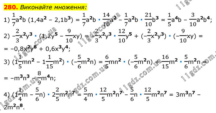 Виконайте множення: 1) 1/7a2b (1,4a2 – 2,1b3) = 1/7a2b ∙ 14/10a2 – 1/7a2b ∙ 21/10b3 = 1/5a4b – 3/10a2b4; 2) –2/3x2y3 ∙ (1,2y5 – 9/10xy) = –2/3x2y3 ∙ 12/10y5 + (–2/3x2y3) ∙ (–9/10xy) = = –0,8x2y8 + 0,6x3y4; 3) (11/5mn2 – 11/15m2) ∙ (–5/6m2n) = 6/5mn2 ∙ (–5/6m2n) + 16/15m2 ∙ 5/6m2n = = –m3n3 – 8/9m4n; 4) (11/4m – 5/6n) ∙ 22/5m2n7 = 5/4m ∙ 12/5m2n7 – 5/6n ∙ 12/5m2n7 = 3m3n7 – 2m2n8.