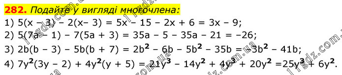 Подайте у вигляді многочлена: 1) 5(x – 3) – 2(х– 3) = 5x – 15 – 2х + 6 = 3х – 9; 2) 5(7а – 1) – 7(5а + 3) = 35а – 5 – 35а – 21 = –26; 3) 2b(b – 3) – 5b(b + 7) = 2b2 – 6b – 5b2 – 35b = –3b2 – 41b; 4) 7у2(3у – 2) + 4у2(у + 5) = 21у3 – 14у2 + 4у3 + 20у2 =25у3 + 6у2.