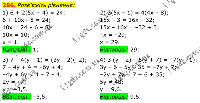 Розв’яжіть рівняння: 1) 6 + 2(5х + 4) = 24; 6 + 10x+ 8 = 24; 10х = 24 – 6 – 8; 10x = 10; х = 1. Відповідь: 1; 2) 3(5х – 1) = 4(4х – 8); 15х – 3 = 16х – 32; 15х – 16х = –32 + 3; –х = –29; х = 29. Відповідь: 29; 3) 7 – 4(у – 1) = (3у – 2)(–2); 7 – 4у + 4 = –6y + 4; –4у + 6у = 4 – 7 – 4; 2у = –7; y = –3,5. Відповідь: –3,5; 4) 3 (у – 2) – 5(у + 7) = –7(у – 1); 3y – 6 – 5у – 35 = –7y + 7; –2у + 7y = 7 + 6 + 35; 5y = 48; у = 9,6. Відповідь: 9,6.
