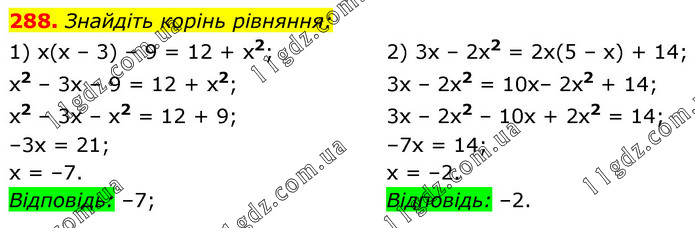 Знайдіть корінь рівняння: 1) x(x – 3) – 9 = 12 + x2; x2 – 3x – 9 = 12 + x2; x2 – 3x – x2 = 12 + 9; –3х = 21; x = –7. Відповідь: –7; 2) 3x – 2x2 = 2x(5 – x) + 14; 3x – 2x2 = 10x– 2x2 + 14; 3x – 2x2 – 10x + 2x2 = 14; –7x = 14; x = –2. Відповідь: –2.