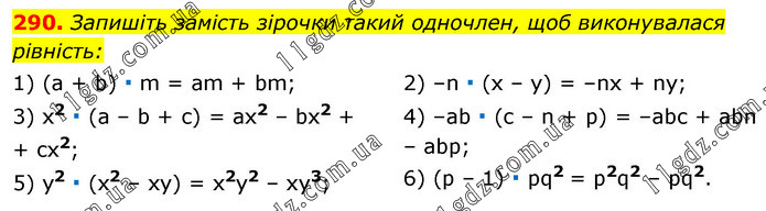 Запишіть замість зірочки такий одночлен, щоб виконувалася рівність: 1) (a + b) ∙ m = am + bm; 3) x2 ∙ (a – b + c) = ax2 – bx2 + + cx2; 5) y2 ∙ (x2 – xy) = x2y2 – xy3; 2) –n ∙ (x – у) = –nx + ny; 4) –аb ∙ (c – n + p) = –abc + abn – abp; 6) (p – 1) ∙ pq2 = p2q2 – pq2.