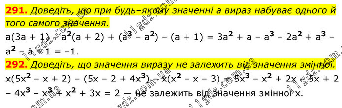 291. Доведіть, що при будь–якому значенні а вираз набуває одного й того самого значення. а(3а + 1) – a2(a + 2) + (a3 – a2) – (a + 1) = 3а2 + a – a3 – 2a2 + a3 – a2 – a – 1 = –1. 292. Доведіть, що значення виразу не залежить від значення змінної. x(5x2 – x + 2) – (5x – 2 + 4x3) – x(x2 – x – 3) = 5x3 – x2 + 2x – 5x + 2 – 4x3 – x3 + x2 + 3x = 2 — не залежить від значення змінної x.