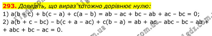 Доведіть, що вираз тотожно дорівнює нулю: 1) a(b – c) + b(c – a) + c(a – b) = ab – ac + bc – ab + ac – bc = 0; 2) a(b + c – bc) – b(c + a – ac) + c(b – a) = ab + ac – abc – bc – ab + + abc + bc – ac = 0.