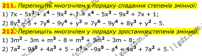211. Перепишіть многочлен у порядку спадання степенів змінної: 1) 7x – 5х3 + х4 – 9x2 + 1 = х4 – 5х3 – 9х2 + 7х + 1; 2) 8y3 – 5 + 7y6 – 9y4 + y2 = 7y6 – 9y4 + 8y3 + y2 – 5. 212. Перепишіть многочлен у порядку зростання степенів змінної. 1) 3m2 – 3m + m3 – 8 = m3 + 3m2 – 3m – 8; 2) 7а2 – 9а5 + 4a3 + 5 – а4 = –9а5 – а4 + 4a3 + 7а2 + 5.