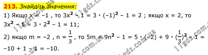 Знайдіть значення: 1) Якщо х = –1 , то 3х2 – 1 = 3 ∙ (–1)2 – 1 = 2 ; якщо х = 2, то 3х2 – 1 = 3 ∙ 22 – 1 = 11; 2) якщо m = –2 , n = 1/3 , то 5m + 9n2 – 1 = 5 ∙ (–2) + 9 ∙ (1/3)2 – 1 = –10 + 1 – 1 = –10.