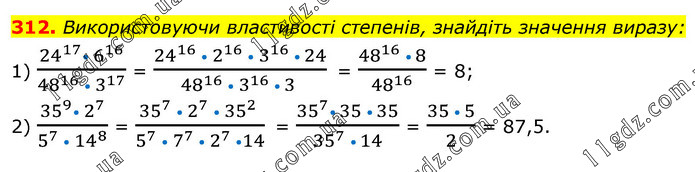 Використовуючи властивості степенів, знайдіть значення виразу: 1) (24^17• 6^16)/(48^16 • 3^17 ) = (24^16 • 2^16 • 3^16 • 24)/(48^16 • 3^16 • 3 ) = (48^16 • 8)/48^16 = 8; 2) (35^9• 2^7)/(5^7 • 14^8 ) = (35^7 • 2^7 • 35^2 )/(5^7 • 7^7 •〖 2〗^7 •14) = (35^7• 35 • 35)/(35^7 • 14) = (35 • 5)/2 = 87,5.