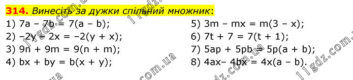 Винесіть за дужки спільний множник: 1) 7а – 7b = 7(a – b); 2) –2у – 2х = –2(y + x); 3) 9n + 9m = 9(n + m); 4) bx + by = b(x + y); 5) 3m – mх = m(3 – x); 6) 7t + 7 = 7(t + 1); 7) 5ар + 5рb = 5p(a + b); 8) 4ах– 4bx = 4x(a – b).